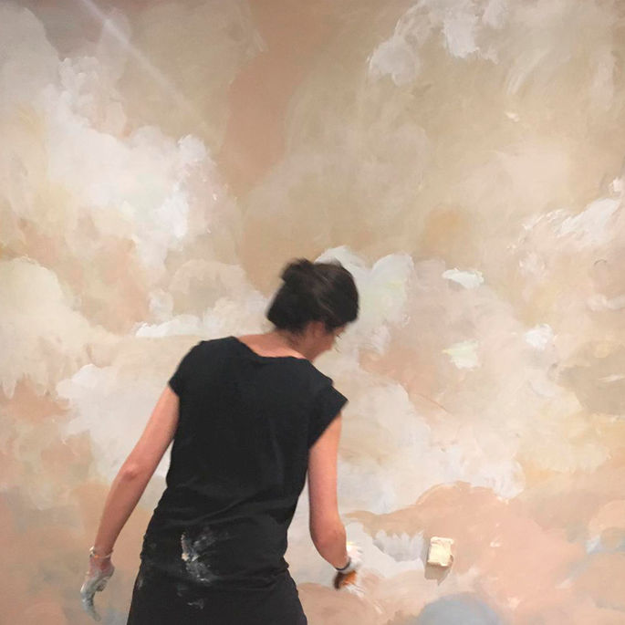 Como pintora, me interesan los grandes formatos y he encontrado en la pintura acrílica el medio ideal para expresarme. Últimamente, estoy disfrutando mucho interviniendo en espacios mediante la pintura mural.